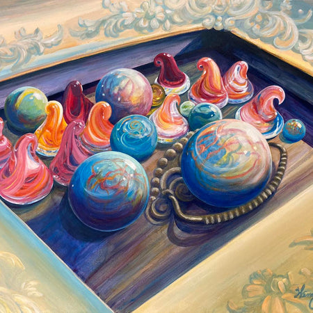 Lately, she has experimented with using acrylic in a watercolor style. Also, she loves the exacting challenge of pencil. A pencil piece on a linen weave board takes around a hundred and twenty hours to complete. The surface of the board adds another dimension in difficulty to achieve a smooth finish in skin tones, but the end result is amazing.