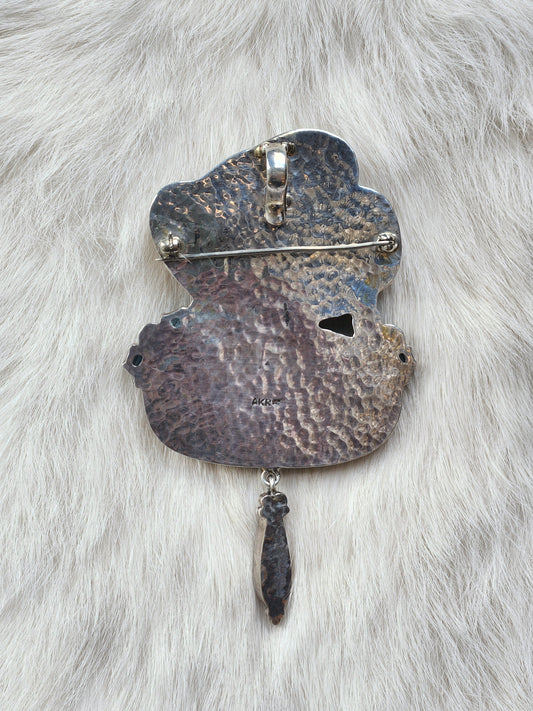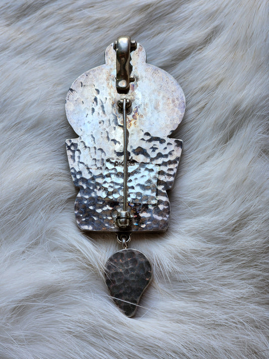 Sterling silver, sometimes with 14Kt and 18kt gold, as well as mixed metals. Incorporating natural minerals, pearls, and fossils with semi-precious stones, Amy's designs become wearable pieces of art. The bold collection consists of pins doubling as pendants, necklaces, bracelets and earrings.