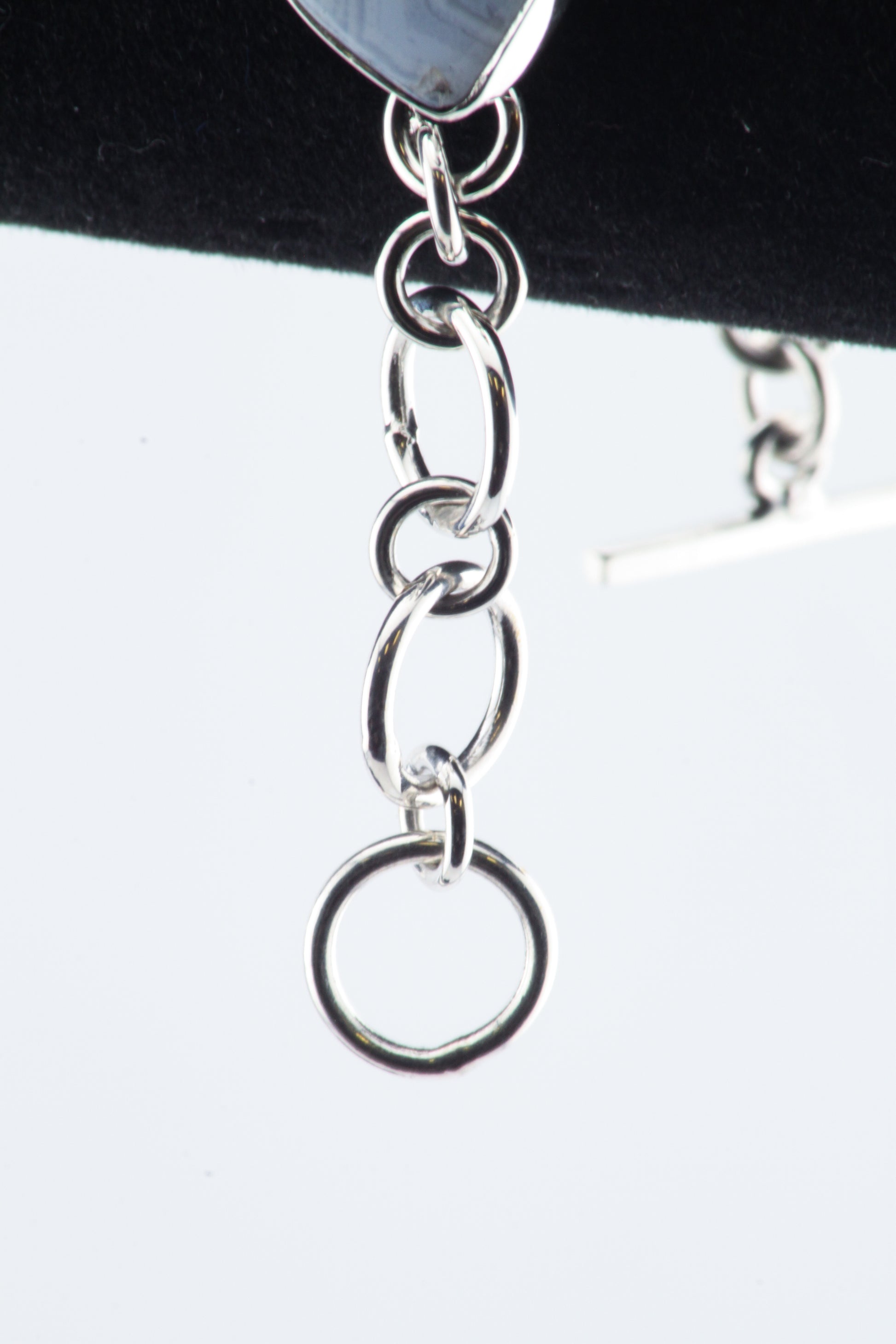 Sterling silver bracelet featuring soothing blue lace agate, celebrated for its delicate banded patterns and calming energy.